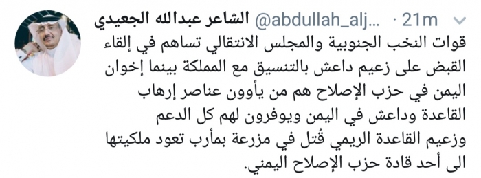 وكتب الجعيدي، في تغريدة له على موقع التواصل الاجتماعي تويتر، تابعها المشهد العربي: "قوات النخب الجنوبية والمجلس الانتقالي تساهم في إلقاء القبض على زعيم داعش بالتنسيق مع المملكة بينما إخوان اليمن في حزب الإصلاح هم من يأوون عناصر إرهاب القاعدة وداعش في اليمن ويوفرون لهم كل الدعم".