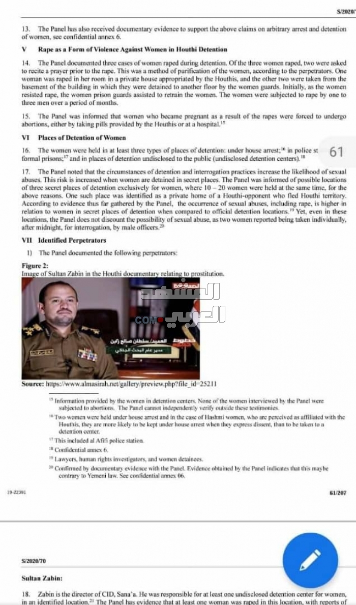أدان فريق الخبراء التابع للأمم المتحدة، القيادي بمليشيا الحوثي سلطان زابن والمُعين مديراً للإدارة العامة للبحث الجنائي في صنعاء, بممارسة التعذيب بحق النساء المختطفات.