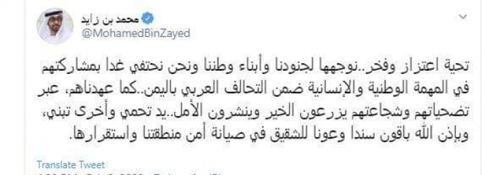 وتعهد باستمرار الجهد الإماراتي في مساندة اليمن ودعمه، قائلا: "بإذن الله باقون سندا وعونا للشقيق في صيانة أمن منطقتنا واستقرارها".