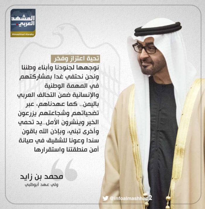 وجه الشيخ محمد بن زايد آل نهيان، ولي عهد أبوظبي، نائب القائد الأعلى للقوات المسلحة الإماراتية، التحية للقوات الإماراتية المشاركة في التحالف العربي باليمن.