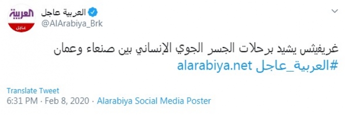 أفادت فضائية العربية الإخبارية، في نبأ عاجل، منذ قليل، بأن المبعوث الأممي إلى اليمن، مارتن غريفيث، أشاد برحلات الجسر الإنساني بين صنعاء وعمان.