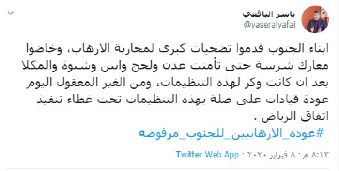 وكتب "اليافعي" في تغريدة عبر حسابه بتويتر، رصدها "المشهد العربي" قال فيها: "أبناء الجنوب قدموا تضحيات كبرى لمحاربة الإرهاب، وخاضوا معارك شرسة حتى تأمنت عدن ولحج وأبين وشبوة والمكلا بعد أن كانت وكر لهذه التنظيمات".