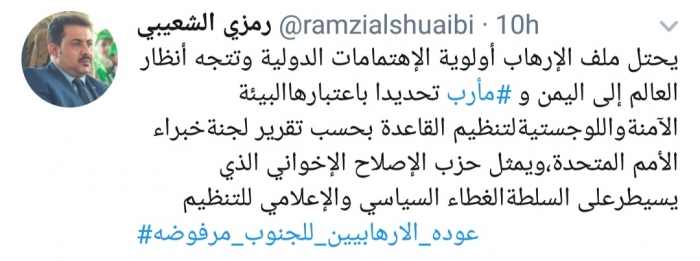 وكتب الشعيبي، في تغريدة له على موقع التواصل الاجتماعي تويتر، تابعها المشهد العربي: "يحتل ملف الإرهاب أولوية الاهتمامات الدولية وتتجه أنظار العالم إلى اليمن ومأرب تحديدا باعتبارها البيئة الآمنة واللوجستية لتنظيم القاعدة بحسب تقرير لجنة خبراء الأمم المتحدة".