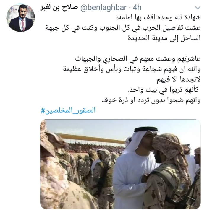 أشاد الإعلامي صلاح بن لغبر، بشجاعة وأخلاق القوات الإماراتية "الصقور المخلصين".