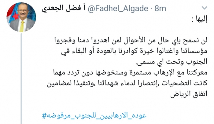 وكتب الجعدي، في تغريدة له على موقع التواصل الاجتماعي تويتر، تابعها المشهد العربي: "لن نسمح بأي حال من الأحوال لمن أهدروا دمنا وفجروا مؤسساتنا واغتالوا خيرة كوادرنا بالعودة أو البقاء في الجنوب وتحت أي مسمى".