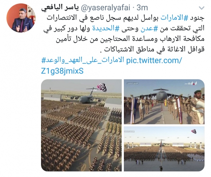 وكتب اليافعي، في تغريدة له على موقع التواصل الاجتماعي تويتر، تابعها المشهد العربي: "جنود الإمارات بواسل لديهم سجل ناصع في الانتصارات التي تحققت من عدن وحتى الحديدة".