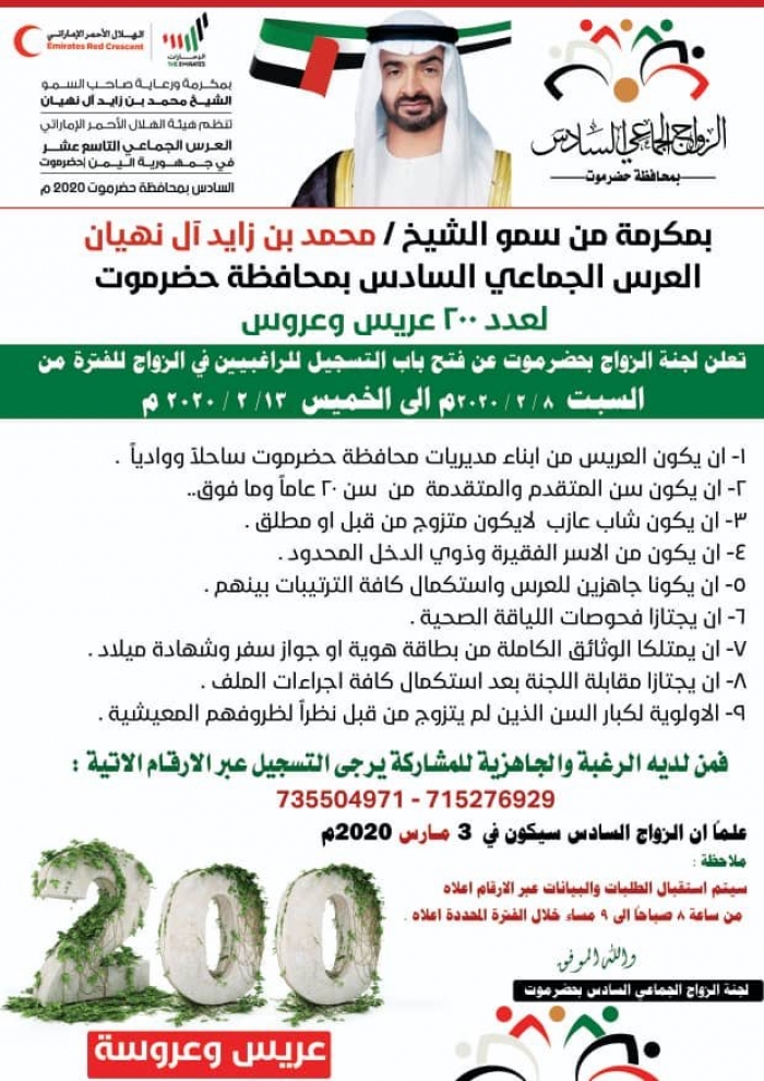 أعلن الهلال الأحمر الإماراتي، عن فتح باب التسجيل في مشروع الزواج الجماعي السادس بعدد 200 عريس وعروس في حضرموت.