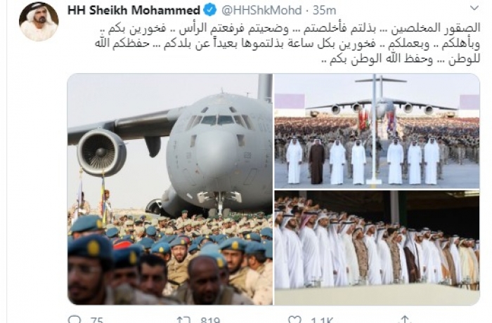 وكان مغردون إماراتيون دشنوا هاشتاج "الصقور المخلصين" لتحية الجنود الإماراتيين العائدين من اليمن، الذين شاركوا ضمن قوات التحالف العربي.