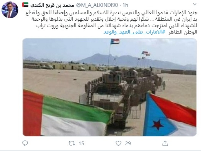 وكتب في تغريدة عبر "تويتر" رصدها "المشهد العربي": "جنود الإمارات قدموا الغالي والنفيس نصرة للإسلام والمسلمين وإحقاقاً للحق ولقطع يد إيران في المنطقة... شكرًا لهم وتحية إجلال وتقدير للجهود التي بذلوها والرحمة للشهداء الذين امتزجت دماءهم بدماء شهدائنا من المقاومة الجنوبية وروت تراب الوطن الطاهر".