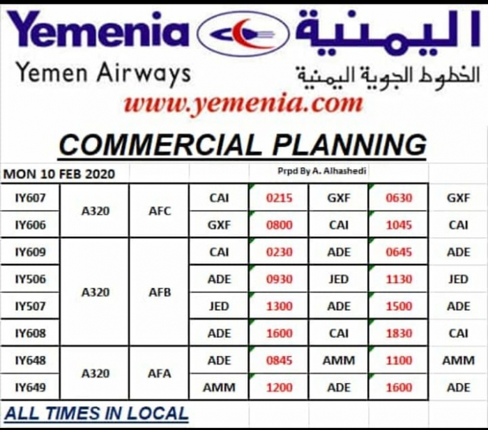 ينشر "المشهد العربي" مواعيد رحلات طيران اليمنية غداً الإثنين، الموافق 10 فبراير 2020.