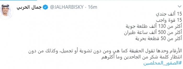 وقال في تغريدة عبر "تويتر" رصدها "المشهد العربي": "15 ألف جندي.. 15 قوة واجب.. أكثر من 130 ألف طلعة جوية.. أكثر من 500 ألف ساعة طيران.. أكثر من 50 قطعة بحرية الأرقام وحدها تقول الحقيقة كما هي ومن دون تشوية أو تجميل، وكذلك من دون انتظار كلمة شكر من الجاحدين وما أكثرهم".