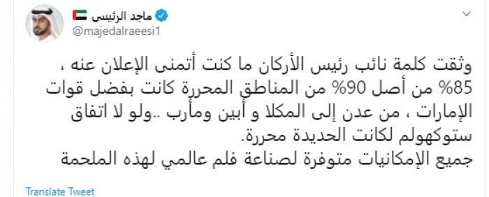 وقال في تغريدة عبر "تويتر" رصدها "المشهد العربي": "وثقت كلمة نائب رئيس الأركان ما كنت أتمنى الإعلان عنه، 85% من أصل 90% من المناطق المحررة كانت بفضل قوات الإمارات، من عدن إلى المكلا وأبين ومأرب.. ولولا اتفاق ستوكهولم لكانت الحديدة محررة. جميع الإمكانيات متوفرة لصناعة فيلم عالمي لهذه الملحمة".