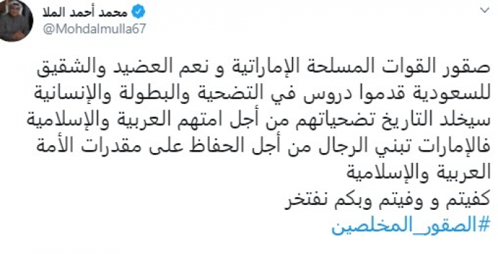 وقال في تغريدة عبر "تويتر" رصدها "المشهد العربي": "صقور القوات المسلحة الإماراتية ونعم العضيد والشقيق للسعودية قدموا دروس في التضحية والبطولة والإنسانية سيخلد التاريخ تضحياتهم من أجل أمتهم العربية والإسلامية فالإمارات تبني الرجال من أجل الحفاظ على مقدرات الأمة العربية والإسلامية كفيتم ووفيتم وبكم نفتخر.. الصقور المخلصين".