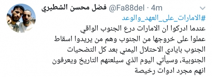 وكتب الشطيري، في تغريدة له عبر موقع التواصل الاجتماعي تويتر، تابعها المشهد العربي: "عندما أدركوا أن الإمارات درع الجنوب الواقي عملوا على خروجها من الجنوب وهم من يريدوا إسقاط الجنوب بأيادي الاحتلال اليمني بعد كل التضحيات الجنوبية".