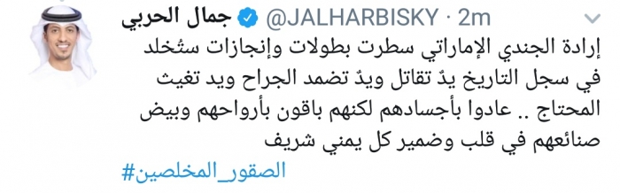 وكتب الحربي، في تغريدة له عبر موقع التواصل الاجتماعي تويتر، تابعها المشهد العربي: "إرادة الجندي الإماراتي سطرت بطولات وإنجازات ستُخلد في سجل التاريخ يدٌ تقاتل ويدٌ تضمد الجراح ويد تغيث المحتاج".
