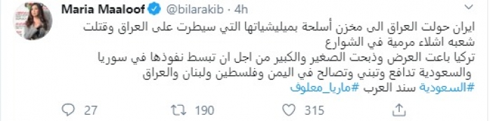 وكتبت في تغريدة عبر "تويتر" رصدها "المشهد العربي": "إيران حولت العراق إلى مخزن أسلحة بميليشياتها التي سيطرت على العراق وقتلت شعبه أشلاء مرمية في الشوارع، تركيا باعت العرض وذبحت الصغير والكبير من أجل أن تبسط نفوذها في سوريا والسعودية تدافع وتبني وتصالح في اليمن وفلسطين ولبنان والعراق السعودية سند العرب".