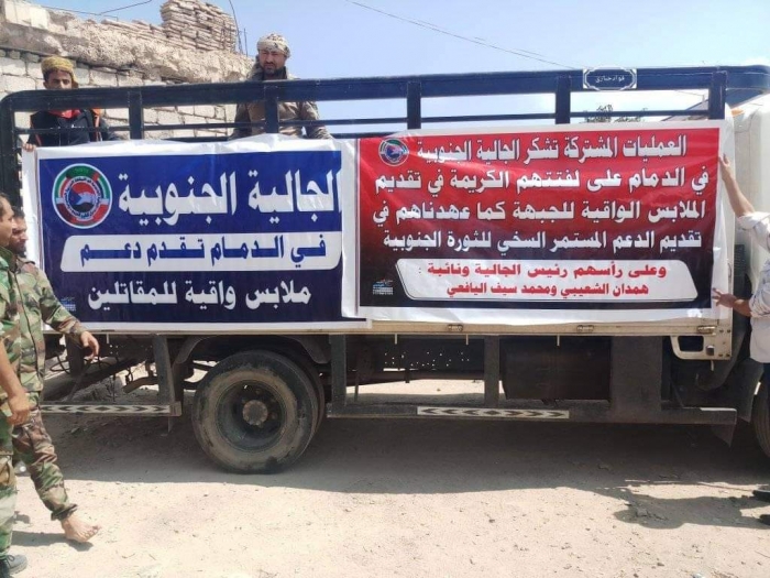 الجالية الجنوبية بالدمام تدعم جبهات الضالع بـالملابس