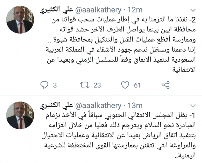 وكتب الكثيري، في سلسلة تغريدات له على موقع التواصل الاجتماعي تويتر، تابعها المشهد العربي: "يظل المجلس الانتقالي الجنوبي سباقاً في الأخذ بزمام المبادرة نحو السلام ويترجم ذلك فعليا من خلال التزامه بتنفيذ اتفاق الرياض بعيدا عن الانتقائية وعمليات الاحتيال والمراوغة التي تتفنن بممارستها القوى المختطفة للشرعية اليمنية".