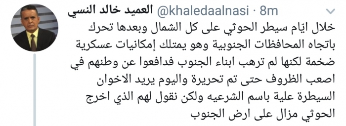 وكتب النسي، في تغريدة له على موقع التواصل الاجتماعي تويتر، تابعها المشهد العربي: "خلال أيّام سيطر الحوثي على كل الشمال وبعدها تحرك باتجاه المحافظات الجنوبية وهو يمتلك إمكانيات عسكرية ضخمة لكنها لم ترهب أبناء الجنوب فدافعوا عن وطنهم في أصعب الظروف حتى تم تحريره".
