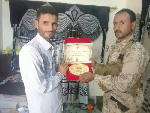 وفي مقر قيادة قوات التحالف العربي سلمت قيادة التحالف شهادة شكر وتقدير للعميد منير اليافعي عرفاناً بجهوده الجبارة في تثبيت الأمن ومكافحة الإرهاب والقضاء عليه وتجفيف منابعه وكذا مواقفة الصلبة حيث حقق العميد اليافعي انتصارات عظيمة منذ تكليفه بقيادة اللواء الاول دعم واسناد .