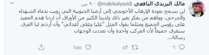 وكتب اليافعي عبر "تويتر":"لن نسمح بعودة الإرهاب الإخونجي إلى أرضنا الجنوبية التي رويت بدماء الشهداء والجرحى".