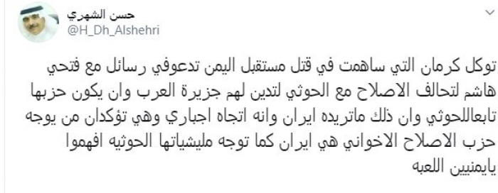 وقال في تغريدة عبر "تويتر" رصدها "المشهد العربي": "توكل كرمان التي ساهمت في قتل مستقبل اليمن تدعوفي رسائل مع فتحي هاشم لتحالف الإصلاح مع الحوثي لتدين لهم جزيرة العرب وأن يكون حزبها تابعاً للحوثي وأن ذلك ما تريده إيران وأنه اتجاه اجباري وهي تؤكدان من يوجه حزب الإصلاح الاخواني هي ايران كما توجه مليشياتها الحوثية افهموا يايمنيين اللعبة".