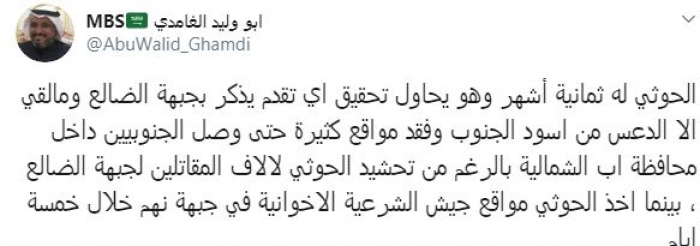 هاجم الناشط السياسي السعودي أبو وليد الغامدي، اليوم، حكومة الشرعية وذلك جراء فقدانها للعديد من الجبهات لصالح مليشيات الحوثي وعلى رأسها "نهم"، مُشيدًا بالقوات المسلحة الجنوبية بعد التصدي للغزو الحوثي على الضالع.