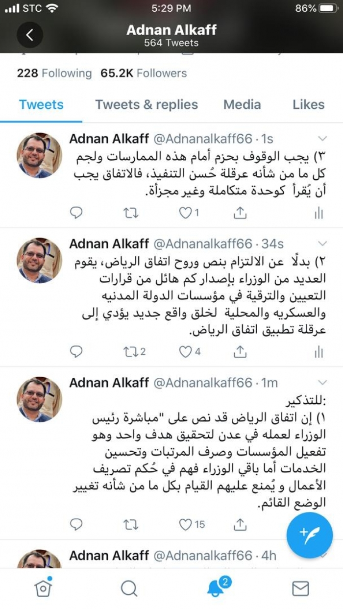وقال الكافي في عدة تغريدات عبر حسابه بـ"تويتر"، إن اتفاق الرياض نص على "مباشرة رئيس الوزراء لعمله في عدن لتحقيق هدف واحد وهو تفعيل المؤسسات وصرف المرتبات وتحسين الخدمات أما باقي الوزراء فهم في حُكم تصريف الأعمال و يُمنع عليهم القيام بكل ما من شأنه تغيير الوضع القائم".