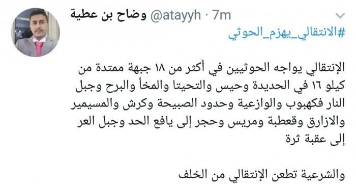 وكتب بن عطية، في تغريدة له على موقع التواصل الاجتماعي تويتر، تابعها المشهد العربي: "الانتقالي يواجه الحوثيين في أكثر من ١٨ جبهة ممتدة من كيلو ١٦ في الحديدة وحيس والتحيتا والمخأ والبرح وجبل النار فكهبوب والوازعية وحدود الصبيحة وكرش والمسيمير والازارق وقعطبة ومريس وحجر إلى يافع الحد وجبل العر إلى عقبة ثرة.. والشرعية تطعن الانتقالي من الخلف".