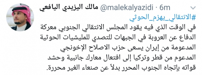 تفاعل الناشط السياسي مالك اليزيدي اليافعي، مع هاشتاج "الانتقالي يهزم الحوثي".