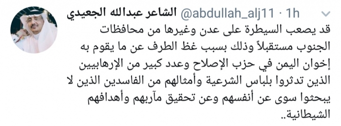 وكتب الجعيدي، في تغريدة له على موقع التواصل الاجتماعي تويتر، تابعها المشهد العربي: "قد يصعب السيطرة على عدن وغيرها من محافظات الجنوب مستقبلاً وذلك بسبب غض الطرف عما يقوم به إخوان اليمن في حزب الإصلاح وعدد كبير من الإرهابيين الذين تدثروا بلباس الشرعية وأمثالهم من الفاسدين الذين لا يبحثوا سوى عن أنفسهم وعن تحقيق مآربهم وأهدافهم الشيطانية".