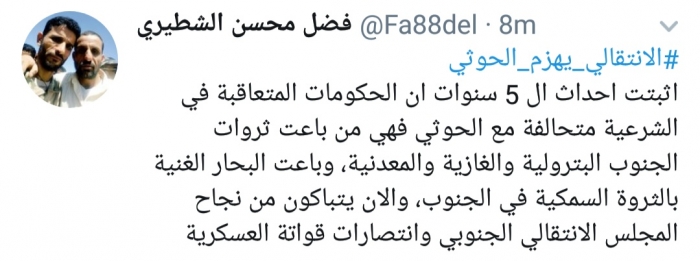 وكتب الشطيري، في تغريدة له على موقع التواصل الاجتماعي تويتر، تابعها المشهد العربي: "أثبتت أحداث ال 5 سنوات أن الحكومات المتعاقبة في الشرعية متحالفة مع الحوثي فهي من باعت ثروات الجنوب البترولية والغازية والمعدنية، وباعت البحار الغنية بالثروة السمكية في الجنوب".