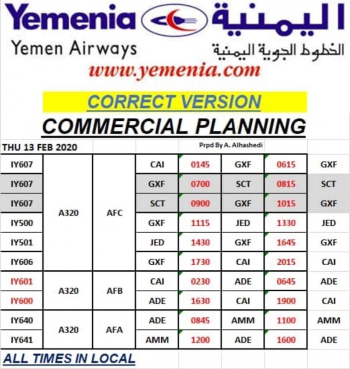 ينشر "المشهد العربي" مواعيد رحلات طيران اليمنية غداً الخميس، الموافق 13 فبراير 2020.