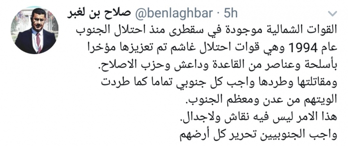 وكتب بن لغبر، في تغريدة له عبر موقع التواصل الاجتماعي تويتر، تابعها المشهد العربي: "القوات الشمالية موجودة في سقطرى منذ احتلال الجنوب عام 1994 وهي قوات احتلال غاشم تم تعزيزها مؤخرا بأسلحة وعناصر من القاعدة وداعش وحزب الإصلاح، ومقاتلتها وطردها واجب كل جنوبي تماما كما طردت ألويتهم من عدن ومعظم الجنوب".