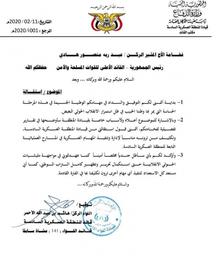 كشفت وثيقة متداولة، عن استقالة هاشم الأحمر، من قيادة المنطقة العسكرية السادسة.