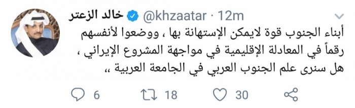 وكتب الزعتر، في تغريدة له عبر موقع التواصل الاجتماعي تويتر، تابعها المشهد العربي: "أبناء الجنوب قوة لا يمكن الاستهانة بها، ووضعوا لأنفسهم رقماً في المعادلة الإقليمية في مواجهة المشروع الإيراني".