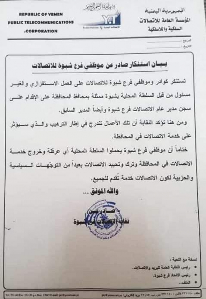 واستنكرت نقابة الاتصالات في المحافظة - عبر بيان – اعتقالهما، ووصفت قرار محافظ شبوة بأنه عمل استفزازي غير مسؤول.