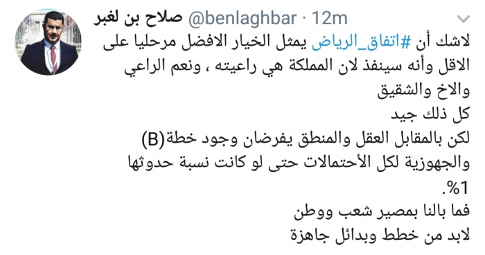 وكتب بن لغبر، في تغريدة له عبر موقع التواصل الاجتماعي تويتر، تابعها المشهد العربي: "لا شك أن اتفاق الرياض يمثل الخيار الأفضل مرحليا على الأقل وأنه سينفذ لأن المملكة هي راعيته، ونعم الراعي والاخ والشقيق".