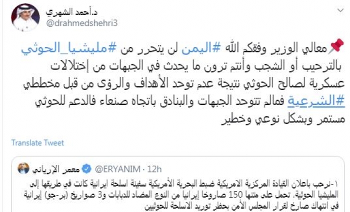 وقال في تغريدة عبر "تويتر" رصدها "المشهد العربي": "معالي الوزير وفقكم الله اليمن لن يتحرر من مليشيا الحوثي بالترحيب أو الشجب وأنتم ترون ما يحدث في الجبهات من اختلالات عسكرية لصالح الحوثي نتيجة عدم توحد الأهداف والرؤى من قبل مخططي الشرعية فمالم تتوحد الجبهات والبنادق باتجاه صنعاء فالدعم للحوثي مستمر وبشكل نوعي وخطير".