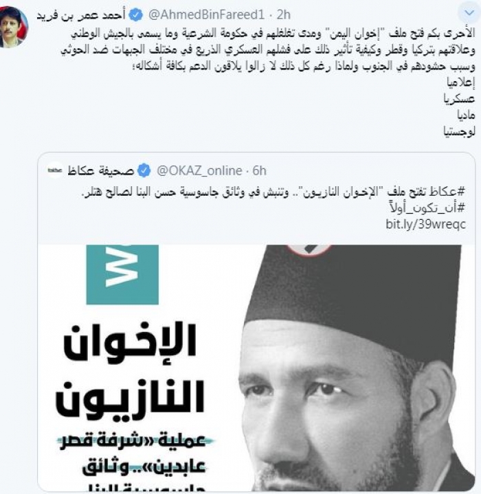 طالب رئيس دائرة العلاقات الخارجية للمجلس الانتقالي الجنوبي في أوروبا، أحمد عمر بن فريد، اليوم، صحيفة عكاظ بفتح ملف "إخوان اليمن" ومدى تغلغلهم في حكومة الشرعية وما يسمى بالجيش الوطني وعلاقتهم بتركيا وقطر.