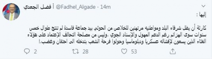 وكتب في تغريدة عبر "تويتر" رصدها "المشهد العربي": "كارثة أن يظل شرفاء البلد ومواطنيه مرتهنين للخلاص من الحوثي بيد جماعة فاسدة لم تنتج طوال خمس سنوات سوى الهزائم رغم الدعم المهول والإسناد الجوي، وليس من مصلحة التحالف الاعتماد على هؤلاء الغثاء الذين يسعون لإفشاله عسكريا ودبلوماسيا وحولوا فرحة الشعب بتدخله إلى احتقان وغضب".