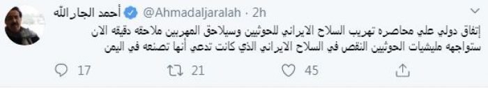 وقال في تغريدة عبر "تويتر" رصدها "المشهد العربي": "اتفاق دولي علي محاصرة تهريب السلاح الإيراني للحوثيين وسيلاحق المهربين ملاحقة دقيقة الآن ستواجه مليشيات الحوثيين النقص في السلاح الإيراني الذي كانت تدعي أنها تصنعه في اليمن".