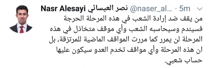 وكتب العيسائي، في تغريدة له عبر موقع التواصل الاجتماعي تويتر، تابعها المشهد العربي: "من يقف ضد إرادة الشعب في هذه المرحلة الحرجة فسيندم وسيحاسبه الشعب".