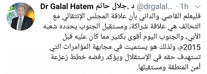 وكتب حاتم، في تغريدة له عبر موقع التواصل الاجتماعي تويتر، تابعها المشهد العربي: "فليعلم القاصي والداني بأن علاقة المجلس الانتقالي مع التحالف هي علاقة شراكة، ومستقبل الجنوب يحدده شعبه الأبي".
