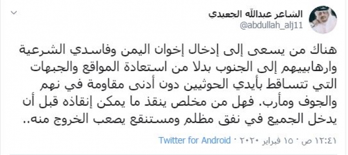 قال الشاعر عبدالله الجعيدي، اليوم، إن هناك من يسعى لإدخال إخوان اليمن وفاسدي حكومة الشرعية وإرهابييهم إلى الجنوب.