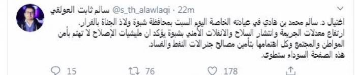 وكتب في تغريدة عبر "تويتر" رصدها "المشهد العربي": "اغتيال د. سالم محمد بن هادي في عيادته الخاصة اليوم السبت بمحافظة شبوة ولاذ الجناة بالفرار. ارتفاع معدلات الجريمة وانتشار السلاح والانفلات الأمني بشبوة يؤكد أن مليشيات الإصلاح لا تهتم بأمن المواطن والمجتمع وكل اهتمامها بتأمين مصالح جنرالات النفط والفساد. هذه الصفحة السوداء ستطوى".