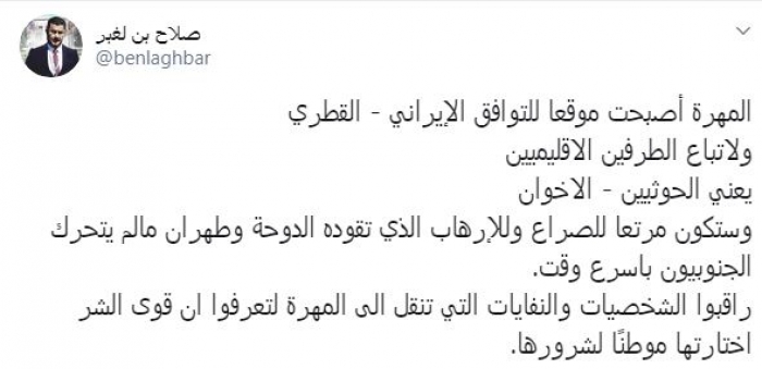 وكتب في تغريدة عبر "تويتر" رصدها "المشهد العربي": "المهرة أصبحت موقعا للتوافق الإيراني – القطري ولـ اتباع الطرفين الإقليميين يعني الحوثيين- الإخوان وستكون مرتعًا للصراع وللإرهاب الذي تقوده الدوحة وطهران ما لم يتحرك الجنوبيون بأسرع وقت".