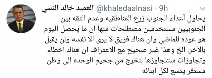 حذر الناشط السياسي العميد خالد النسي، الجنوبيين من محاولات زرع المناطقية وتغييب الثقة.