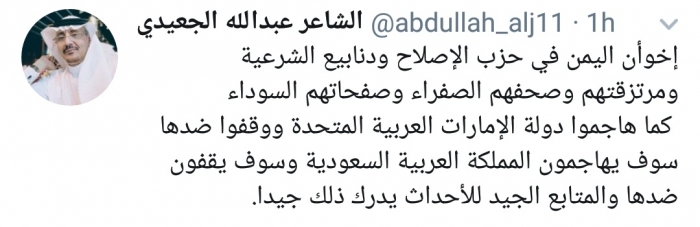 وكتب الجعيدي، في تغريدة له عبر موقع التواصل الاجتماعي تويتر، تابعها المشهد العربي: "إخوان اليمن في حزب الإصلاح ودنابيع الشرعية ومرتزقتهم وصحفهم الصفراء وصفحاتهم السوداء كما هاجموا دولة الإمارات العربية المتحدة ووقفوا ضدها سوف يهاجمون المملكة العربية السعودية وسوف يقفون ضدها والمتابع الجيد للأحداث يدرك ذلك جيدا".