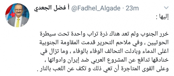 وكتب الجعدي، في تغريدة له عبر موقع التواصل الاجتماعي تويتر، تابعها المشهد العربي: "حُرر الجنوب ولم تعد هناك ذرة تراب واحدة تحت سيطرة الحوثيين".